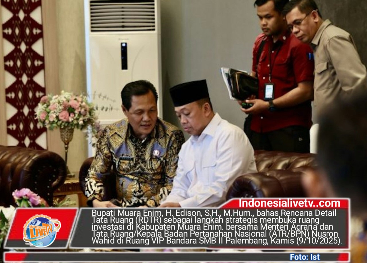 Indonesialivetv.com, PALEMBANG – Bupati Muara Enim, H. Edison, S.H., M.Hum, bersama Menteri Agraria dan Tata Ruang/Kepala Badan Pertanahan Nasional (ATR/BPN) Nusron Wahid di Ruang VIP Bandara SMB II Palembang, Kamis (9/10/2025).