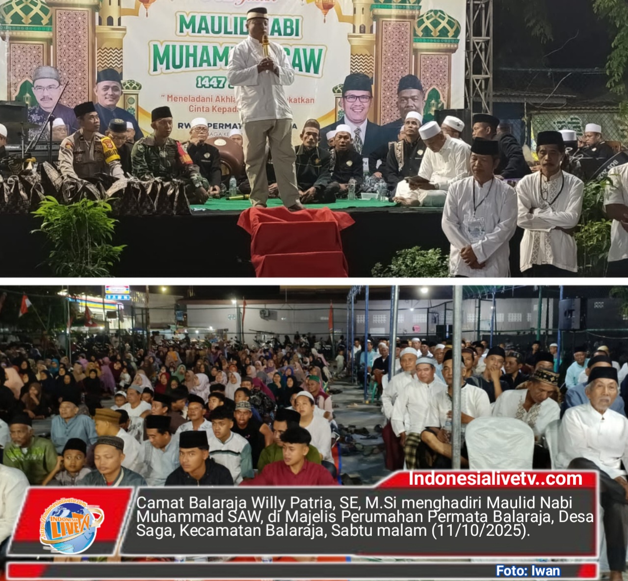 Indonesialivetv.com, Tangerang | Camat Balaraja Willy Patria, SE, M.Si menghadiri Maulid Nabi Muhammad SAW, di Majelis Perumahan Permata Balaraja, Desa Saga, Kecamatan Balaraja, Sabtu malam (11/10/2025).