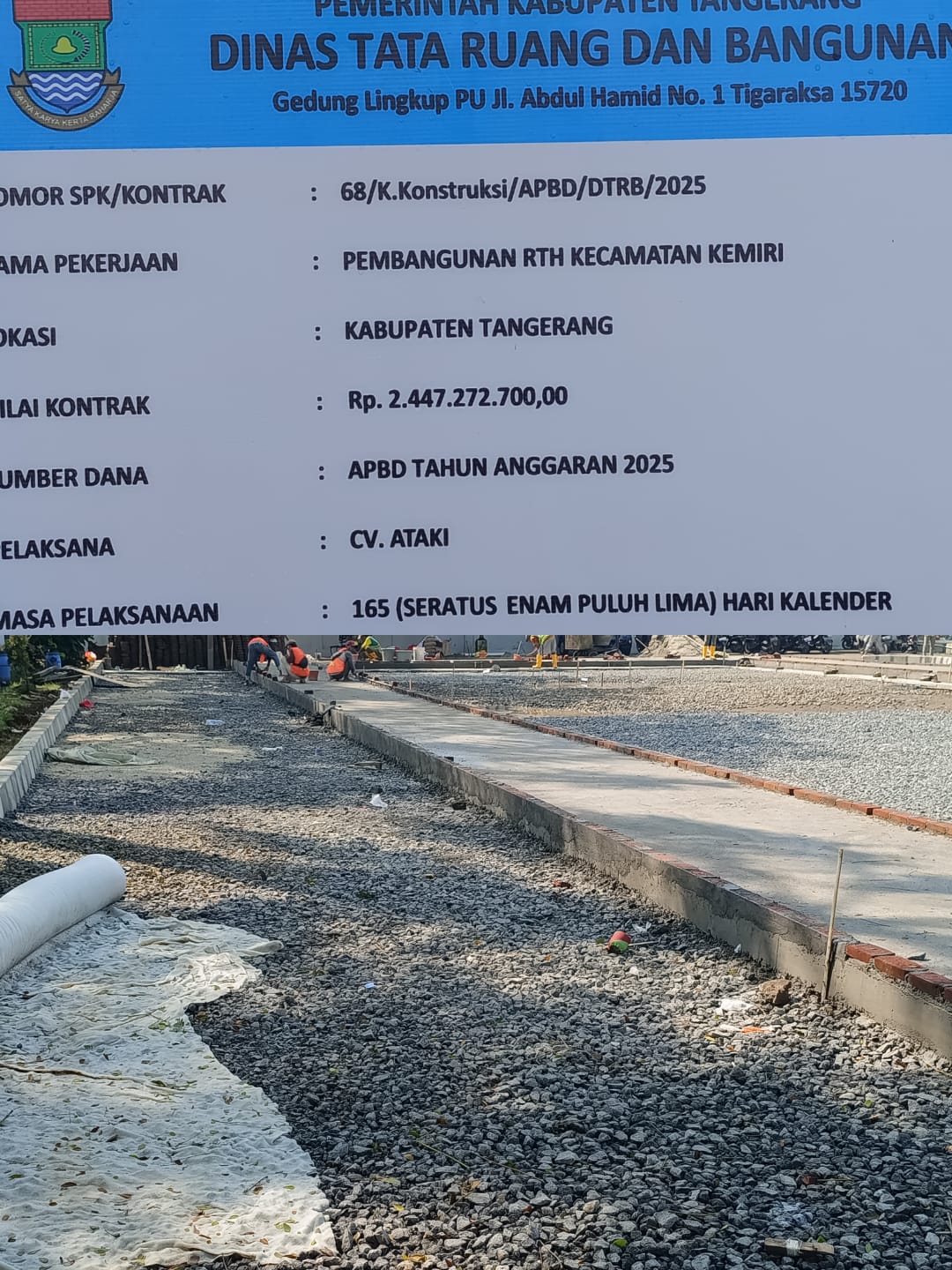 Indonesialivetv.com TANGERANG- Proyek pembangunan RTH Kecamatan Kemeri dari Dinas Tata Ruang dan Bangunan (DTRB) Kabupaten Tangerang Provinsi Banten yang dikerjakan oleh jasa konstruksi CV. ATAKI, bernomer kontrak. 68/K.Konstruksi/APBD/DTRB/2025 dengan nilai anggaran sebesar, Rp. 2.447.272.700, 00’_ (dua miliard empat ratus empat puluh tujuh juta dua ratus tujuh puluh dua ribu tujuh ratus rupiah) sumber dana Pendapatan Belanja Daerah (APBD) T/A 2025, ada ditemukan kejanggalan yang diduga tidak sesuai dengan spesifikasi teknis dan Standar Operasional Prosedur (SOP) yang diakibatkan dari minimnya pengawasan pihak dinas terkait.